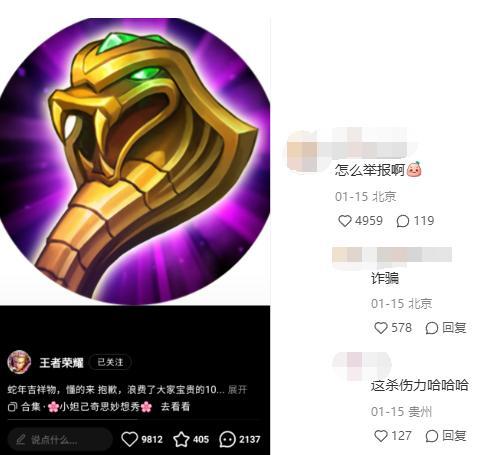 這股風潮源於1月中旬,當時王者官方先發了個整活視頻,宣佈蛇年吉祥物是遊戲裏蛇型外觀的裝備“夢魘之牙”。被“騙”進來的玩家大呼上當,開玩笑要舉報抽象官方。