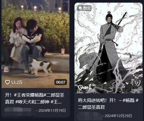 像去年抖音上很火的“開!”,就出自王者的英雄“楊戩”二技能的隨機語音,後來生活、寵物向的視頻也跟風在用,最後居然跟黑神話悟空裏的二郎神聯動上了;