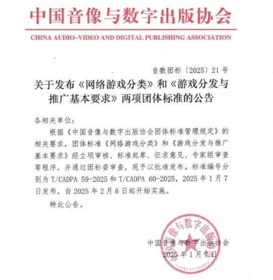 根據《中國音像與數字出版協會團體標準管理規定》的相關要求,團體標準《網絡遊戲分類》和《遊戲分發與推廣基本要求》經立項審覈、標準起草、徵求意見、專家組審查等程序,並通過團標委審查,現予以批准發佈。