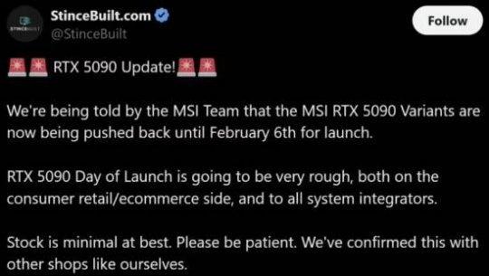 微星官方 Discord 發佈消息稱,預計在 1 月 30 日(發售日)不會通過其官方商店提供任何 RTX 5090 庫存。該公司將允許預訂,但僅限於已經確認的庫存,這些卡預計將於 2 月 6 日開始向客戶發貨。
