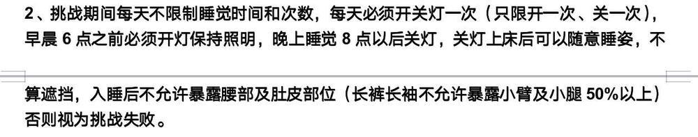 挑戰者必須在指定房間中居住,每天10點熄燈、6點開燈,一天中只能開關燈一次。