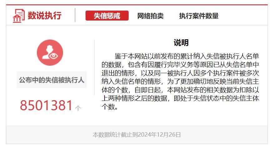 根據中國執行信息公開網數據,截至2024年12月26日,我國的“失信被執行人”,也就是俗話說的“老賴”,已超過850萬個。
