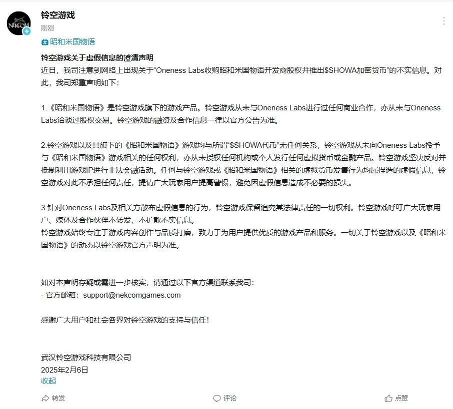 2月5日,一家名爲「Oneness Labs」的初創公司向多家海內外媒體同步了通稿,稱他們收購了《昭和米國物語》開發商鈴空遊戲的部分股權,並推出了與之相關的加密貨幣 $SHOWA。