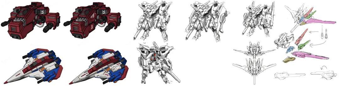 但事實上不管是早期的像素小飛機,還是後期我們嘗試設計的機體,團隊對機甲的癡迷似乎都一發不可收拾。有些同事可以直接3D上手設計,有些同事則喜歡先手稿開始。不管擅長的是什麼工具,在短短的半年內,在沒有反應過來之前,團隊已經從設計可愛的小飛機,迅速變成了具備完整可變形機甲設計能力的團隊。