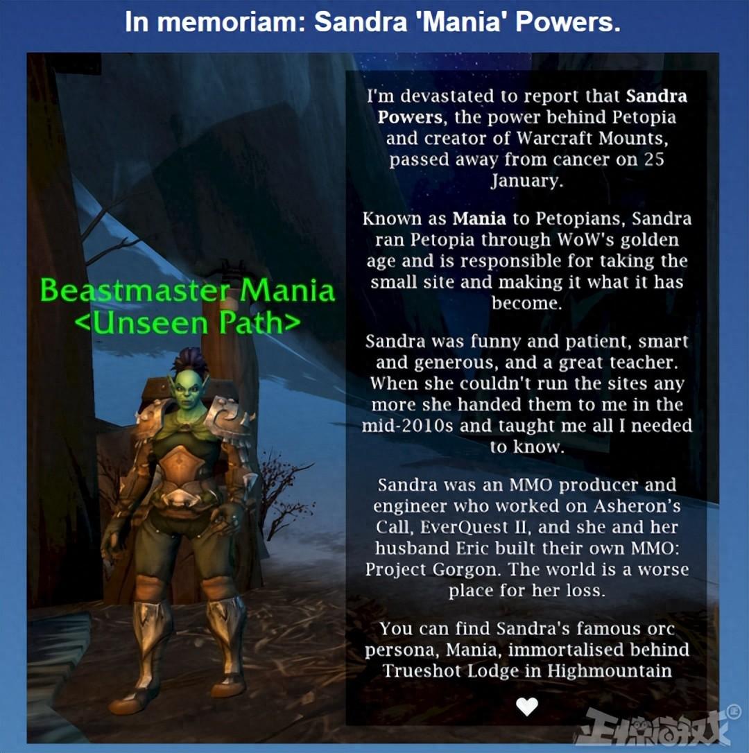 我懷着悲傷的心情在此宣佈,著名獵人寵物網站Petopia和坐騎網站Warcraft Mounts的創始人桑德拉"瑪尼婭"鮑爾斯(Sandra "Mania" Powers,以下簡稱桑德拉)因癌症逝世,享年52歲。