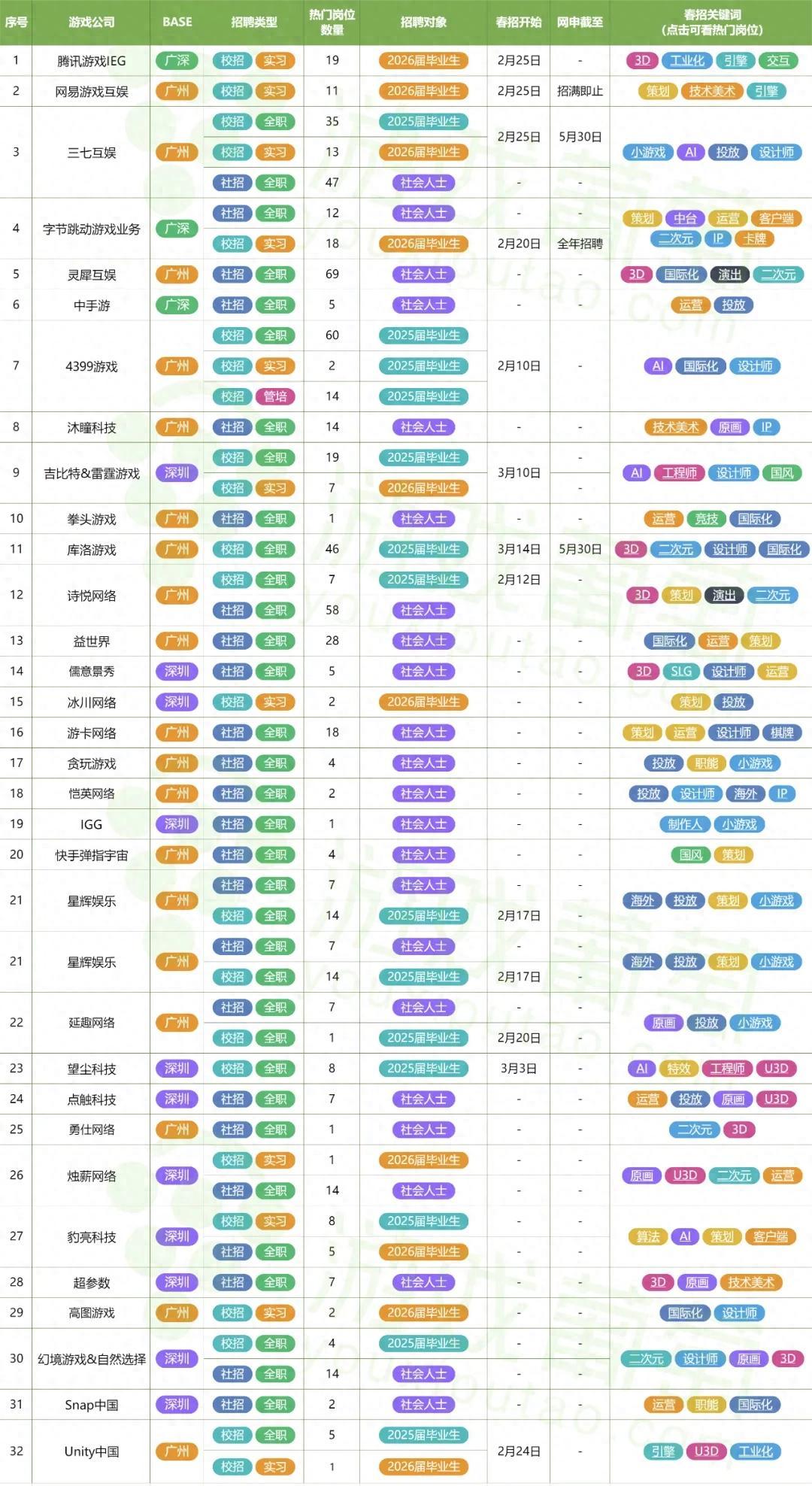 爲此,葡萄君蒐集整理了32家廣深廠商(含分部),共629個春招熱門崗位信息,希望藉此洞察一些廣深遊戲圈的趨勢,給在廣深求職的遊戲人一些參考。