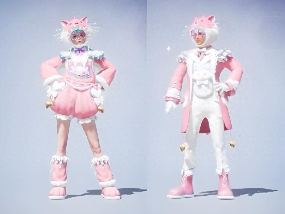 另外兩款套裝雖然也是“粉色品質”,但兌換所需碎片僅爲主套裝的一半,也就是160個碎片。首先是這款惡魔喵喵,第一眼看有點像改版的“羅小黑”套裝。
