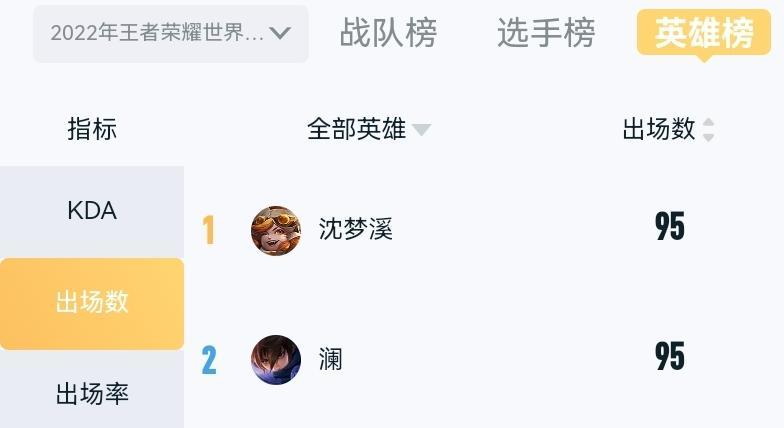 沈夢溪在2022年王者榮耀世界盃冠軍賽上的出場次數是所有英雄當中最多的,次數高達95次,跟瀾的出場次數是一樣的。