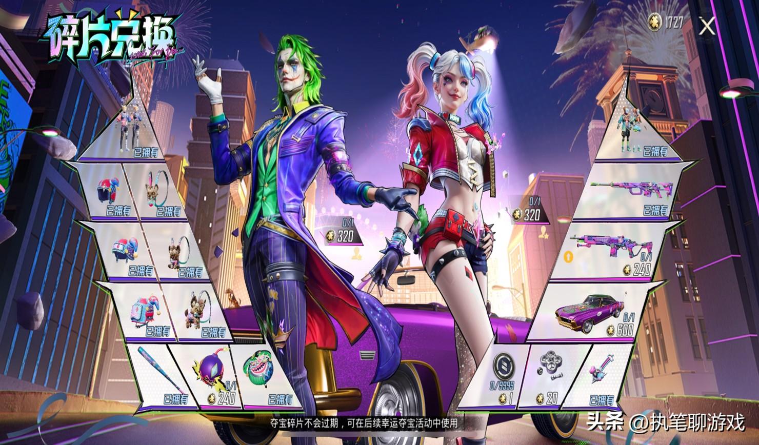 平日裏的“中轉盤”通常都是3個套裝,只有1個粉色等級的C位,另外2個幾乎都是紫色等級,然而DC小丑系列有2個C位;載具皮膚多數都是被光子單獨拎出來,讓玩家用提車幣兌換,而這次則是直接出現在轉盤當中,而且兌換所需要的碎片高達600個之多。