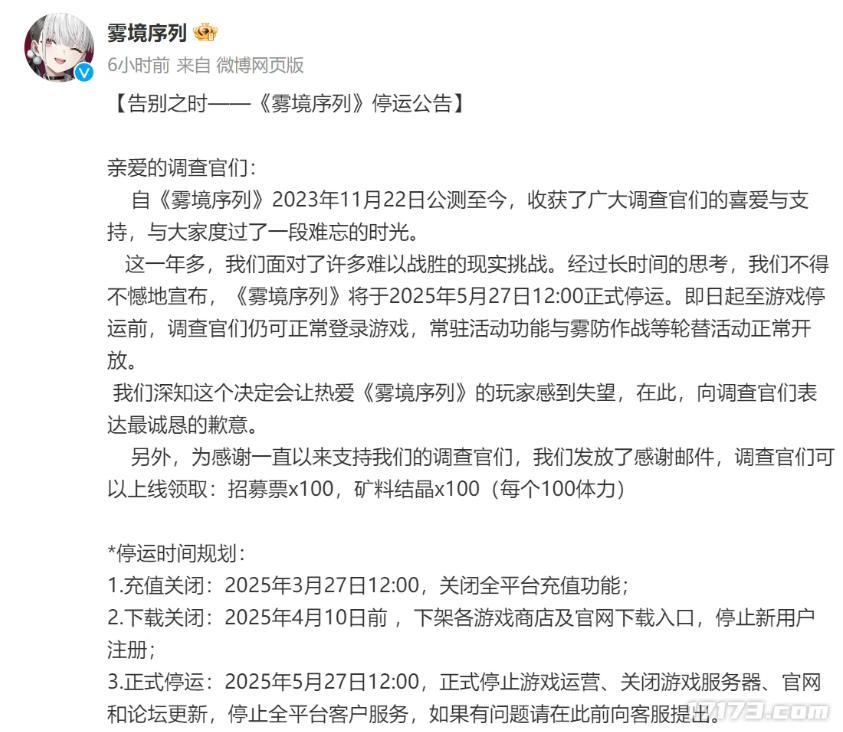 劃重點:二次元遊戲《霧境序列》宣佈將於2025年5月27日正式停運