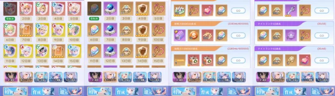 再往後的一個小時內,遊戲會不斷解鎖將近20多個新的功能和版塊,配套贈送的抽卡資源也十分誇張,我個人的情況是,抽了差不多300~350發。值得一提的是,我總共只購買了3個160日元的最小禮包,但VIP等級還是通過各種白嫖,升到了2級。