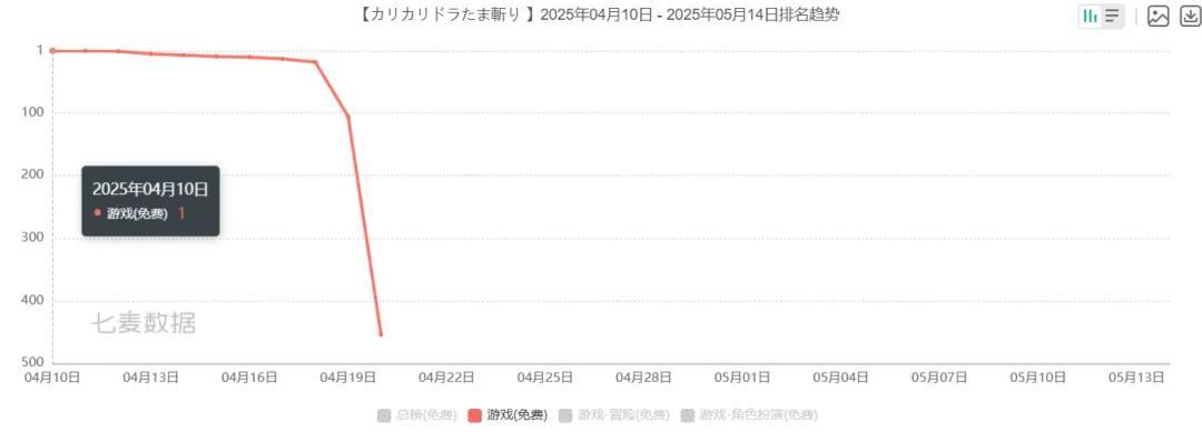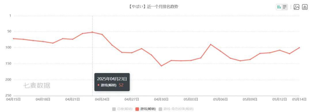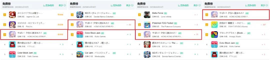 但結果來看,《完蛋少女》在免費榜的粘性意外的高,看看這一個月以來給它陪跑的產品吧:4月10日,兩款不知名本土炮灰新遊;4月18日,空降暢銷榜Top 1的《SD高達G世紀 永恆》;5月4日,騰訊搜打撤扛把子《三角洲行動》手遊,以及去年底到現在依舊強勢的《寶可夢TCG》手遊……這麼一比,是不是倍有面子?