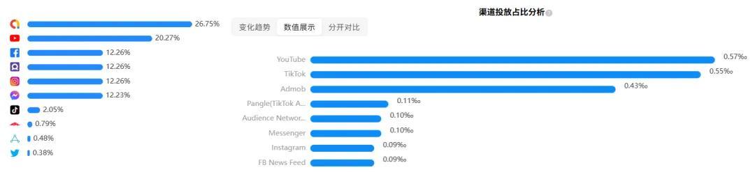 從開始投放到現在,《完蛋少女》投放的廣告總數超過14000條,創意總數約2900條,投放最多的渠道是Google Admob、YouTube、Facebook,其次是Audience Network、Instagram、Messenger,另外這款遊戲在TikTok的投放量雖然不是最多,但在TikTok渠道內與其他廣告主相比,《完蛋少女》的廣告佔比卻不低。