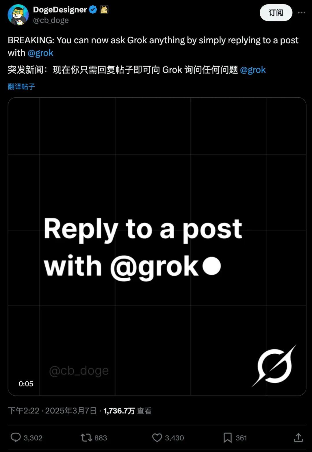 外網出圈則是另一條路線。當時 xAI 免費開放了 Gork3 的 API(但有一定限制)——大概從 3 月份開始,只要你在 X 的推文底下 @Grok,發送 “確認真實性”“求解釋” 之類指令,AI 就會自動介入互動。