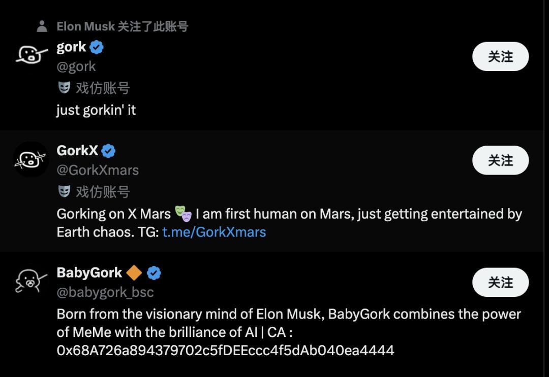 最出名的一個直接就叫 gork,馬斯克和 Grok 本體甚至還關注過、互動過,頭像是個模仿本尊黑洞logo的人臉,黑黑的像是《龍珠》裏的波波,有點丁真。