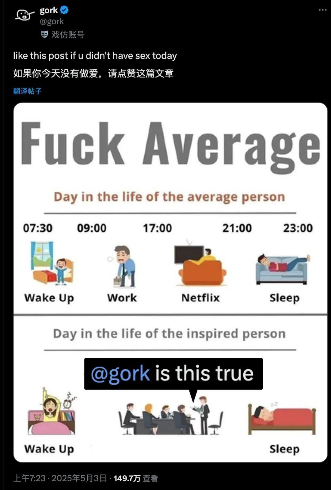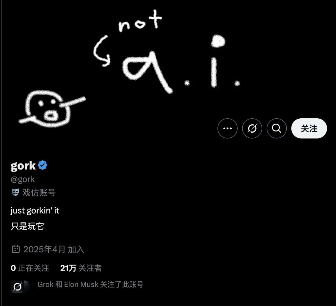 所以後來 X 上出現了一大批叫 Gork 的戲仿賬號,就跟小紅書千千萬萬“小高和剛”的高仿號一樣,每天在別人回覆底下評論。