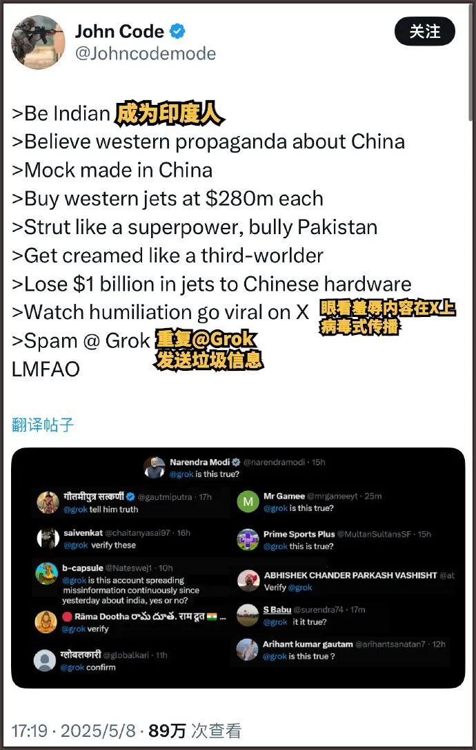 像前段時間,印度剛買的陣風戰機不是被 J10C 打了麼?X 上面一堆心碎三哥在新聞帖子下面不停地 @Grok is This True?