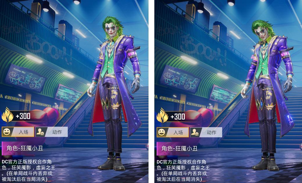 不同於影視的敘事場景有足夠空間可以用「單優雅外形+瘋狂舉動」/「單瘋狂外形+優雅舉動」來塑造小丑的矛盾設定,《和平精英》用短短几秒的待機動作轉變演繹出了“共生”。