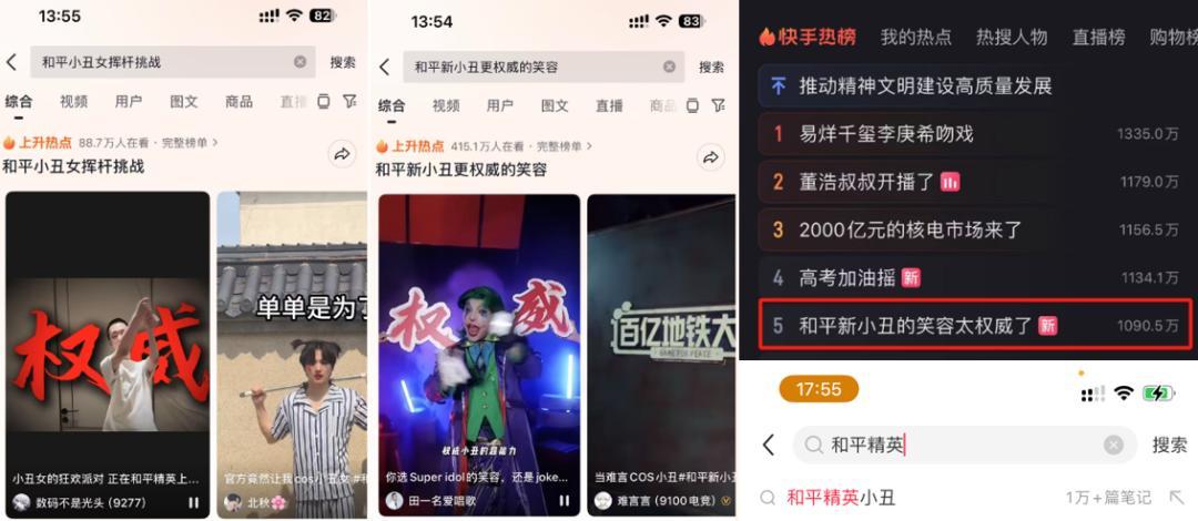 具體到熱度上,在抖音和快手兩大短視頻平臺,#和平精英聯動DC小丑#、#和平新小丑更權威的笑容#、#和平小丑女揮杆挑戰#等話題接連登上熱榜,短短5天時間拿下了過億的播放量,在小紅書平臺搜《和平精英》,跳出的前五個話題裏有3個是“和平精英小丑聯動”相關,且單第一個話題相關筆記數量就已經暴漲到了1萬+。