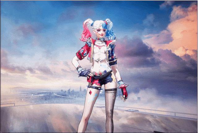 可以看到,《和平精英》中的狂魅哈莉選用了漫畫風做角色的身材呈現,你甚至能看到馬甲線,加上破洞的漁網襪、腹部腿部的彩繪塗鴉以及站立時的wink表情(這個表情也是哈莉·奎茵在《猛禽小隊》中的出圈劇照),處處都在放大其魅力,但,手腕上一層套一層的尖刺裝飾又在傳遞着“不好惹”的信號。