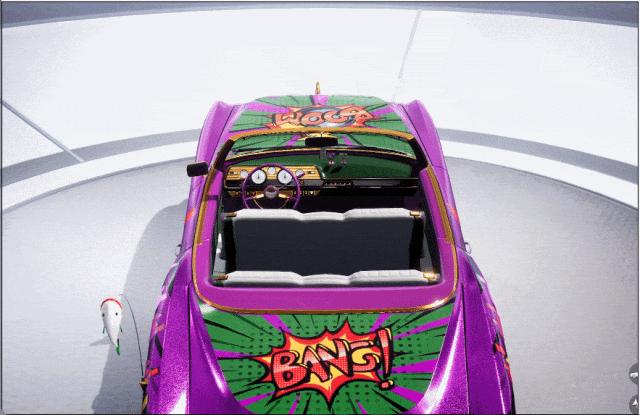 狂魘小丑和狂魅哈莉角色上各有象徵對方的“玩偶掛件”,出場也有共舞的聯動片段,它可以對應上二人的甜蜜期;而高人氣的鬣狗揹包又在提醒着“波折”的存在(影視劇中哈莉的寵物鬣狗是被小丑甩後出現);再看有着小丑標誌HAHAHA閃耀貼紙的載具,裏面細節亦有二人的故事,車內的哈莉形象彈簧飾品、小丑標牌背後的“mad love”(中文譯爲瘋狂的愛)以及車頭小標的“鬣狗”形象,又似乎在傳遞“割捨不掉的愛”。
