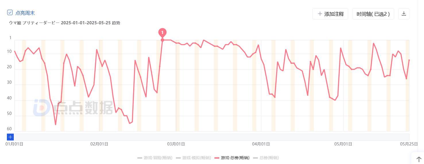 首先是賽馬娘IP本身的影響力。2021年2月海外版一上線便迅速登頂日本iOS暢銷榜,首周流水超過一億元。四年過去了遊戲依然保持在暢銷榜的前列,在今年2月和3月遊戲也曾兩度登頂暢銷榜。