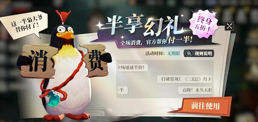 具體來說,《三幻2》拿出了超大比例的減氪方案。它並非電商先抬高價格再打折的套路,常見的648只需要328塊就能拿到,還有首充雙倍,並且遊戲內所有的“氪金消費”項目包括月卡、禮包等等都是如此,真“三幻2爲你買單”。