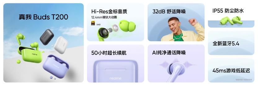 此次發佈會還帶來了真我TWS新品——真我Buds T200。作爲百元級市場的“越級”之作,真我Buds T200搭載12.4mm鍍鈦大動圈,錄音室級超高清音質通過了Hi-Res小金標認證,並升級支持32dB靜謐降噪,提供50小時超長續航。全新的金屬質感工藝,帶來高端視覺和觸覺體驗。真我Buds T200起售價129元,今天正式開售。