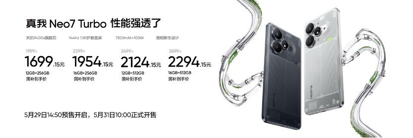 真我Neo7 Turbo售價1999元起,將於5月29日14:50開啓預售,5月31日10:00正式全渠道開售,全系享國補,到手價僅需1699.15元起,首銷用戶享12期免息等購機福利。