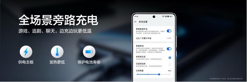 在充電體驗上,本次還帶來了改變用機習慣的黑科技——全場景旁路充電。在邊玩邊充基礎上,全面優化追劇、導航等場景體驗,邊用邊充不發燙,有效保護電池壽命,並支持多適配器快充協議。