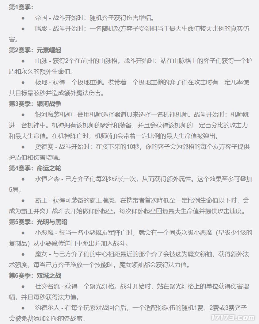 但在迴歸的26個老羈絆中間,也不乏湊數的羈絆,讓人十分懷疑這些羈絆的實際強度。比如說S1的帝國(隨機帝國棋子獲得傷害加成)、S2的山脈(多兩個山脈格子)、S3的奧德賽(開局的傷害加成)、S8的吉祥物(陣亡後,給隊伍提升治療加成)、S10的爵士樂(根據羈絆激活數量給額外的屬性)、S11的天龍之子(戰鬥後8秒召喚天龍擊暈對面)。