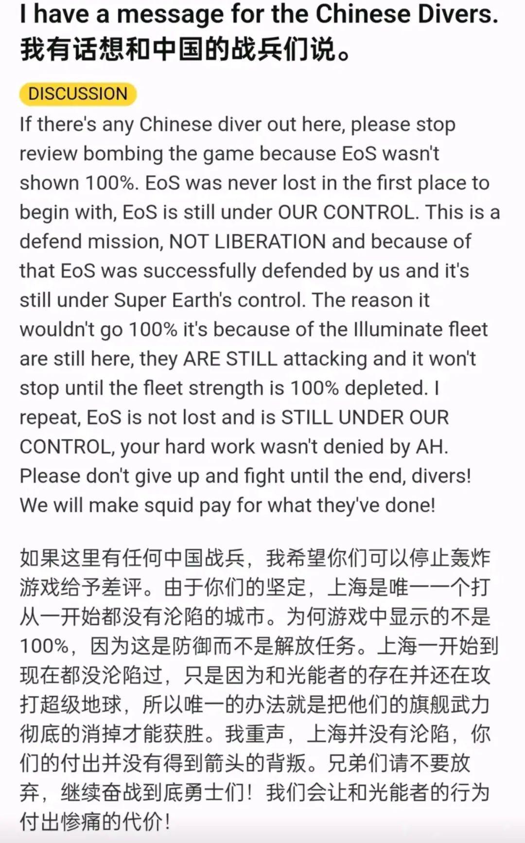 由於網絡環境的特殊性,國內玩家很難直接讓箭頭理解他們的horse飛得有多高。在昨天清一色的憤怒之後,現在,國內玩家社區對箭頭的這波操作持兩種主要態度。其一認爲,這次活動的邏輯雖然是“解放戰爭”,但給出的進度條其實是“抵抗進度”而不是“解放進度”,光能族的攻擊會源源不斷到來,所以直到活動結束之前,“抵抗進度”都無法達到100%,這也是上海沒能徹底解放的原因,所以並不是官方故意噁心人。
