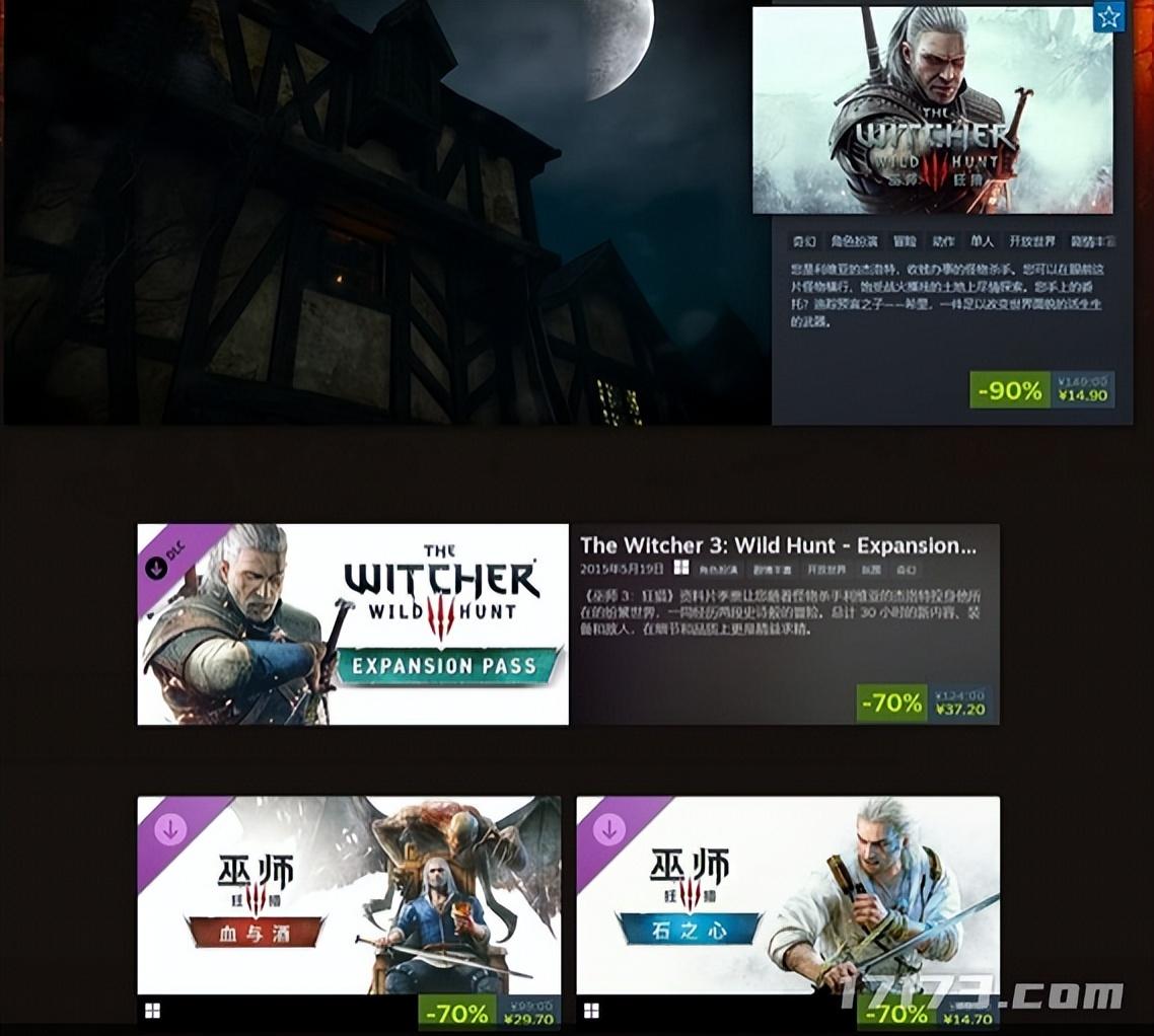 在Steam平臺上,《巫師3:狂獵》的本體與DLC也是開啓了史低特惠,本體低至1折,DLC低至3折。