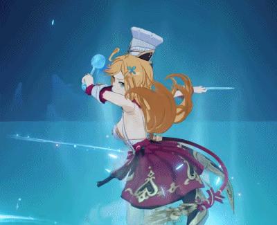 愛可菲的給玩家的第一感覺像是“廚房戰神”和“星空少女”結合,身着料理廚師服、白色絲襪上居然嵌着星空光點,疑似絲柯克同款技術下放。 更絕的是她手持廚師刀和勺以及“憑空掏鍋”技能,完美契合廚娘主題。