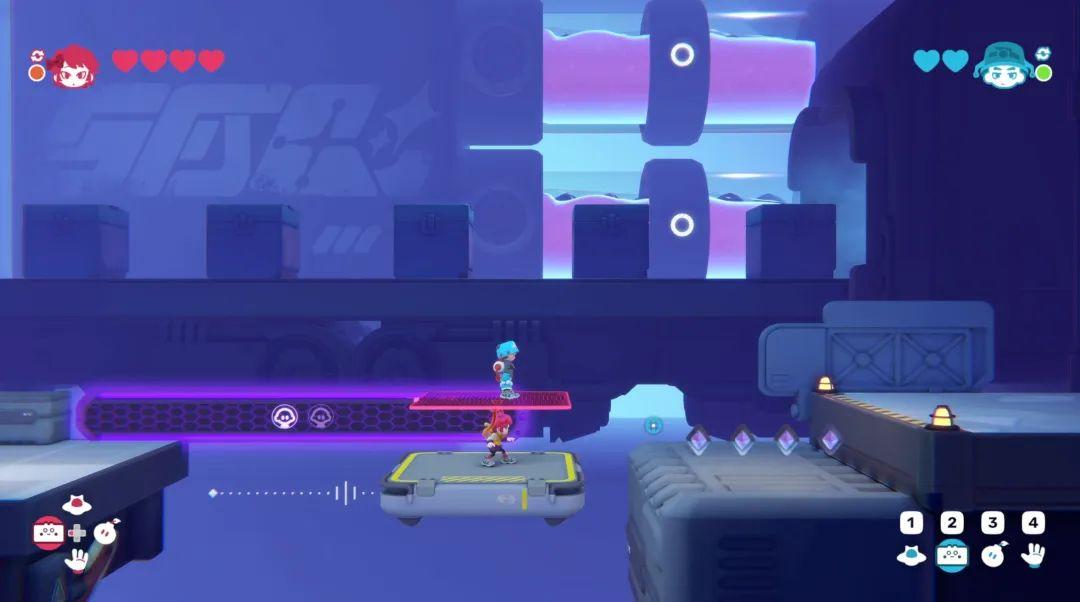 舉例來說,A玩家可以切換綠與黃,B玩家可以切換紅與藍。那在關卡中,就會出現這種設計:A玩家需要切成黃色,站在黃色史萊姆中(只有與史萊姆同色纔不會受傷),舉起道具板托起B玩家,而B玩家則要根據敵人身上的綵球,來不斷換色攻擊。