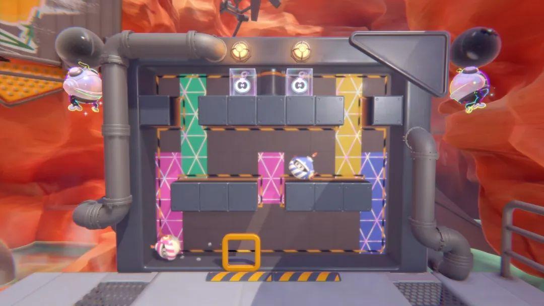 比如後期,有一關的主題是彈珠。你和朋友,就得把角色變成圓球炸彈,但不是爲了炸東西,而是讓兩個角色,進入各種盒子迷宮,配合解開各種巧妙的機關,就像那種鋼珠迷宮玩具一樣。