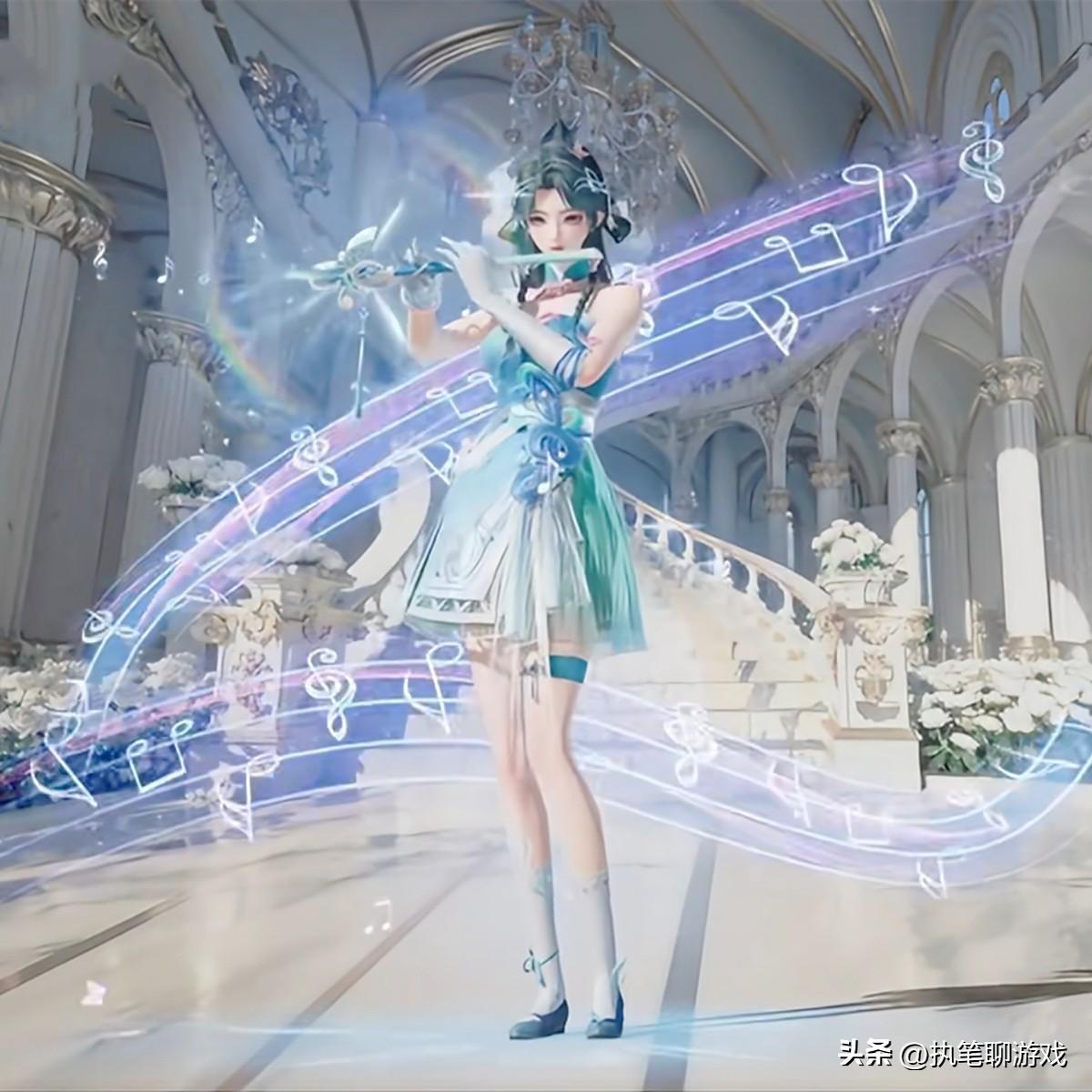 接下來登場的是同爲紫色等級的角色“樂音”,也算是此次四個角色中唯一的國風類型,一身藍粉交織的連衣裙,特意加入的“音符”點綴細節,看起來還算是馬馬虎虎吧~可惜這種白色的中筒襪有些突兀,如果設計成光着腳丫子的形象,應該會得到更多玩家的喜歡。