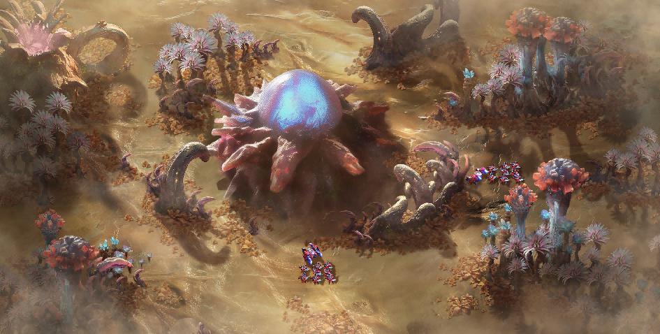 菌蝕之域不是一塊靜態的沙盤,而是一座會呼吸的活體迷宮。地表每寸土壤都在分泌腐蝕酶,形成不斷移動的致命陷阱;巨型孢囊像跳動的心臟,週期性爆發猩紅孢子風暴,讓原本暢通的行軍路線瞬間變成減速泥潭。最致命的是晶化菌塔羣釋放的神經毒素——它不僅能遮蔽視野,還會讓玩家的雷達掃描系統徹底失靈。