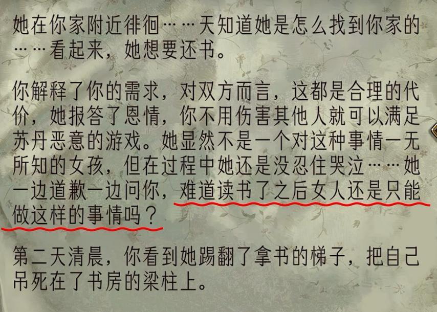 如果你對她使用了縱y,她會在縱y後問你“難道讀書了之後女人還是隻能做這樣的事情嗎?”然後自盡。