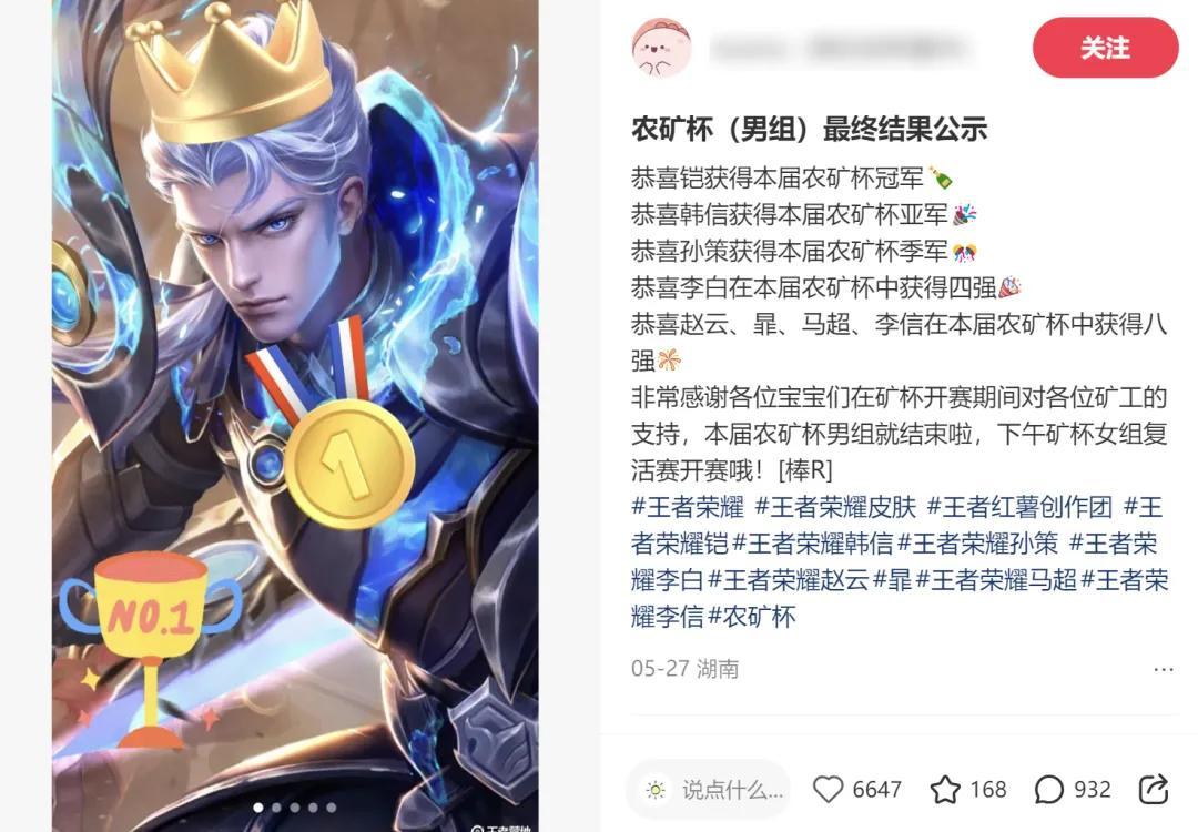 你想想看:打麻將的人會對"八萬"有感情嗎?但《王者榮耀》玩家真會把英雄當賽博分身:農礦杯角色投票時,玩家恨不得給本命英雄打榜到手抽筋——這種「雙向奔赴」,纔是王者IP真正的魅力。