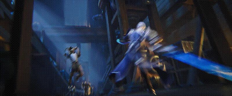 比如有一段情節是:替妹妹背罪的凱因,爲了逃脫審判家族的抓捕,在船廠與審判軍展開的追逐戰。這段劇情沒依靠太多華麗炫酷的特效,但場景構圖和節奏的把控,都體現出了步步逼近的壓迫感,主角和敵人鬥智鬥勇、優勢互換,再到狂鐵支援進場……讓整段戰鬥充滿了變數與看點。