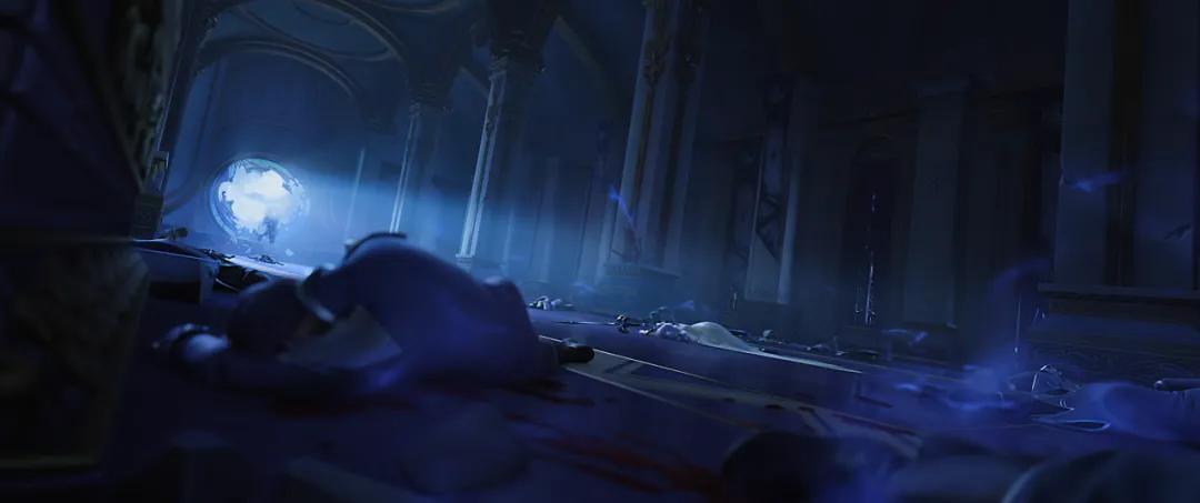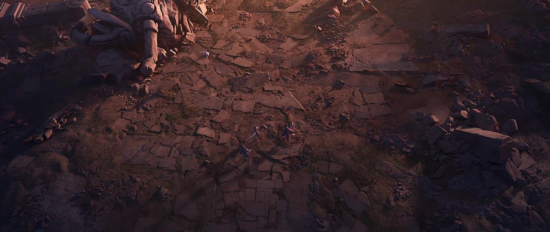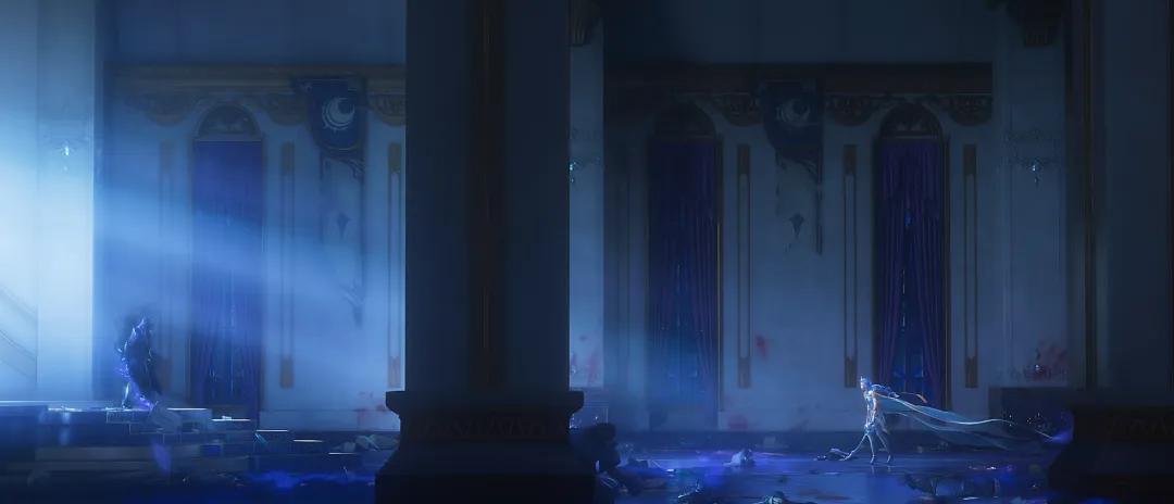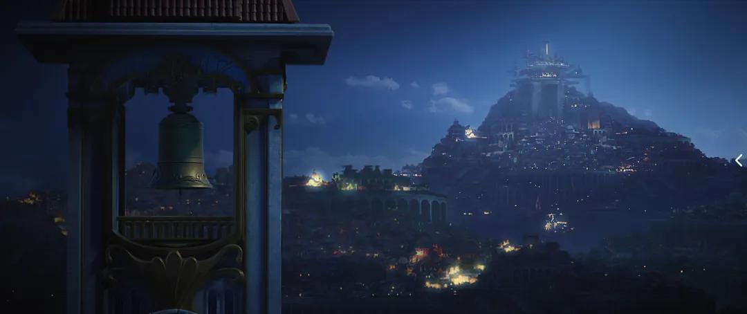 比如《王者榮耀》中只作爲英雄背景板的城市「海都」,在動畫中被完整地復現了出來:有恢弘的格局、熱鬧的海港……能從簡短的畫面中,感受到十一個家族迥異的建築風格和穿着打扮。甚至在一閃而過的鏡頭中,複雜的石磚紋理、空中漂浮的灰塵、月光灑下的影子等等都清晰可見。