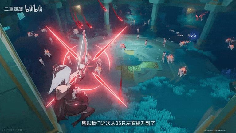 針對這一點《二重螺旋》製作人在前瞻中說到,在三測他們已經將同屏怪物數量翻倍,從原本的25只翻到了現在的50只。數字的提升絕對沒有演示來得直接,這次怪從四面八方來,戰場雖然更加擁擠、混亂,但也更有割草的感覺。