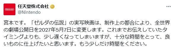 任天堂代發宮本茂的話:我是宮本。由於製作方面的原因,《塞爾達傳說》真人電影的全球公映日期將更改爲2027年5月7日。雖然比之前公佈的檔期稍晚了些,但我們希望能投入充足的時間來打磨出一部優秀的作品。請再給我們一些時間。