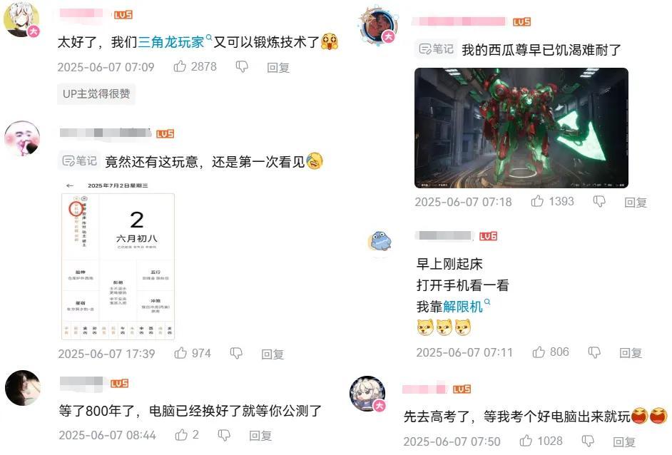 評論區裏,很多玩家也已經飢渴難耐了。有人等不及想再次掏出自己塗裝的個性機甲,有人發現7月2號適宜「安機械」的巧合,也有人說「等了800年,電腦已經換好了,就等你公測」……