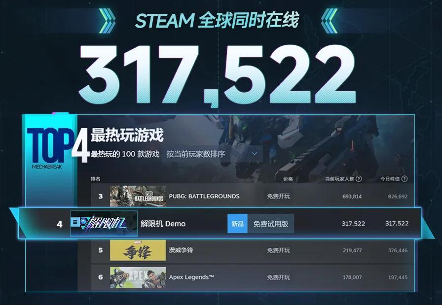 首先,在3月份《解限機》開啓全球風暴測試期間,就有超過350萬名玩家參與遊戲測試。這除了讓《解限機》在Steam願望單排行榜上躋身前列之外,也把它在Steam的同時在線人數幹到了31.7萬,位居Steam當日全球排名第4位。海外遊戲媒體pcgames表示,《解限機》Demo在當時「絕對統治」了Steam。