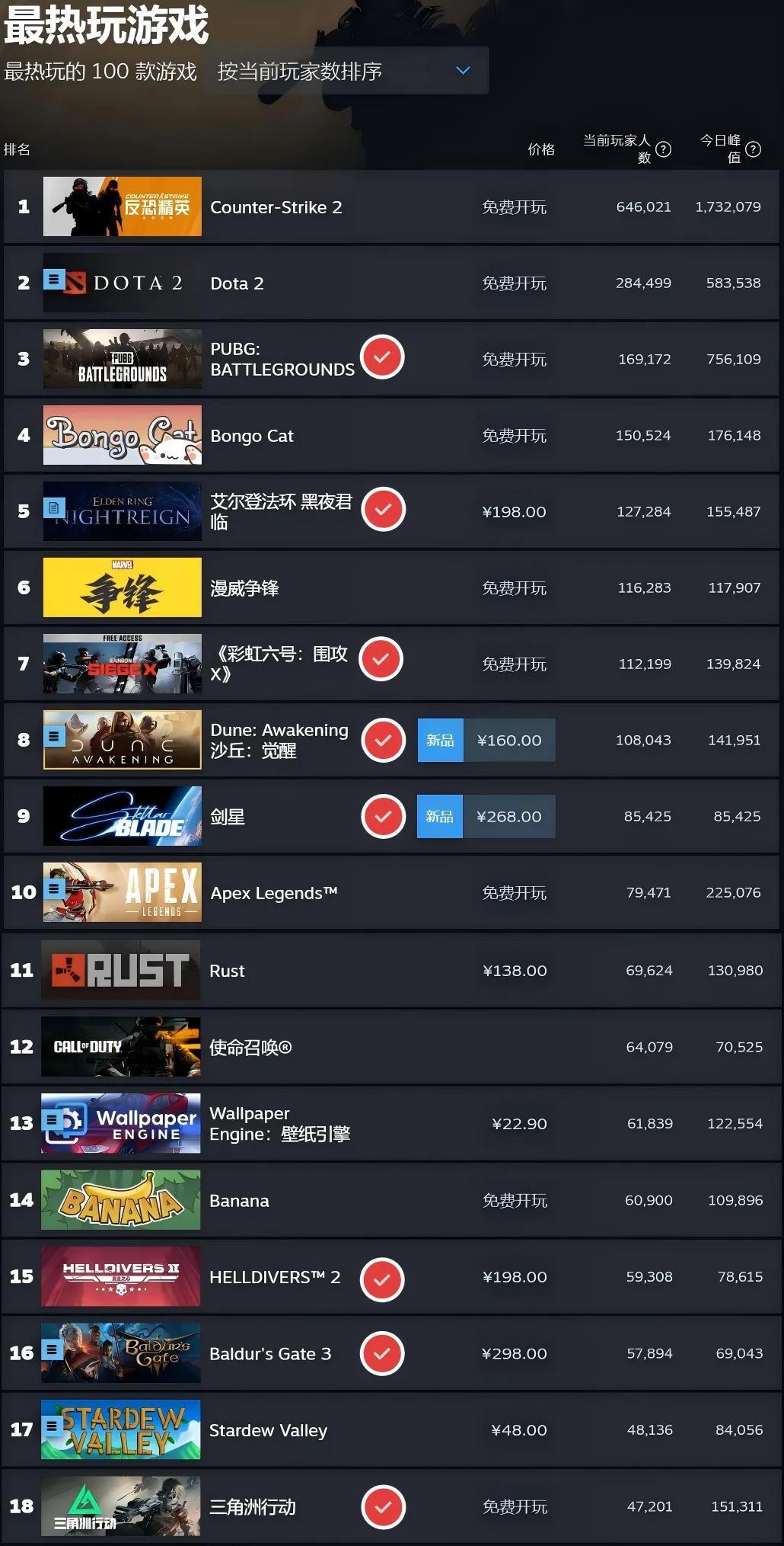 至少目前就Steam來看,近半數熱門頭部遊戲,都與騰訊有關——6月12日《劍星》發售後,Steam最熱玩遊戲榜單前18名裏,有8款遊戲皆是騰訊背景。
