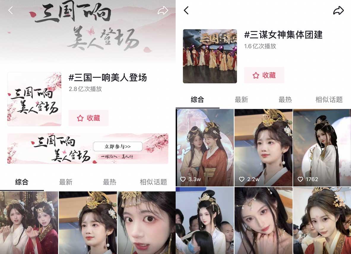 嗶哩嗶哩遊戲發行團隊在抖音上發起的#三國一響美人登場 和#三謀女神集體團建 話題分別獲得2.8億和1.6億的播放量。一方面通過極高的曝光量讓《三國:謀定天下》迅速進入到泛ACG用戶視野中,吸引不同興趣領域用戶的關注擴大遊戲的受衆範圍;另一方面大量用戶對話題的關注和討論,使得《三國:謀定天下》品牌更加深入人心,強化其品牌影響力;此外話題活動往往能激發用戶的創作熱情,積極參與不僅提高了遊戲玩家黏性,也促進更多潛在用戶參與進來,推動《三國:謀定天下》破圈發展。