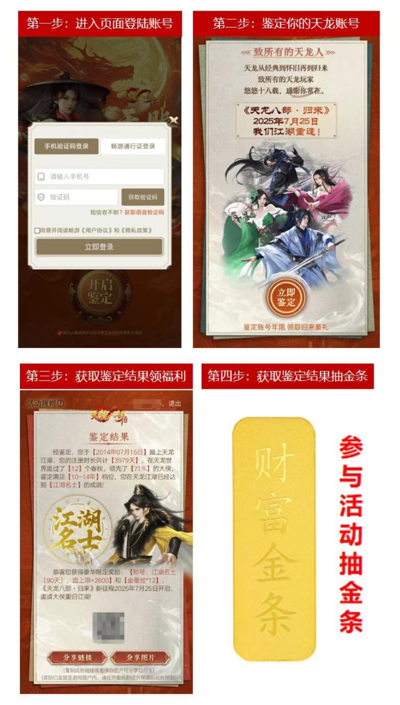 想要回歸的老玩家還能參與【天龍賬號鑑定活動】,根據自己賬號下的天龍IP遊戲遊玩時長,獲取公測限定專屬稱號&金蠶絲獎勵,抽取5g天龍定製金條。