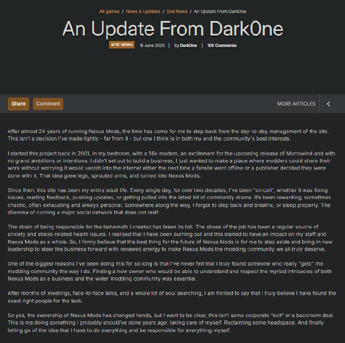 在公告中,Dark0ne表示:運營Nexus Mods近24年後,他決定從網站的日常管理中退下來。這個決定並非輕率之舉,是經過數月的會議、面對面交談和大量深思熟慮後做的決定,這是對自己和社區都是最好的選擇。